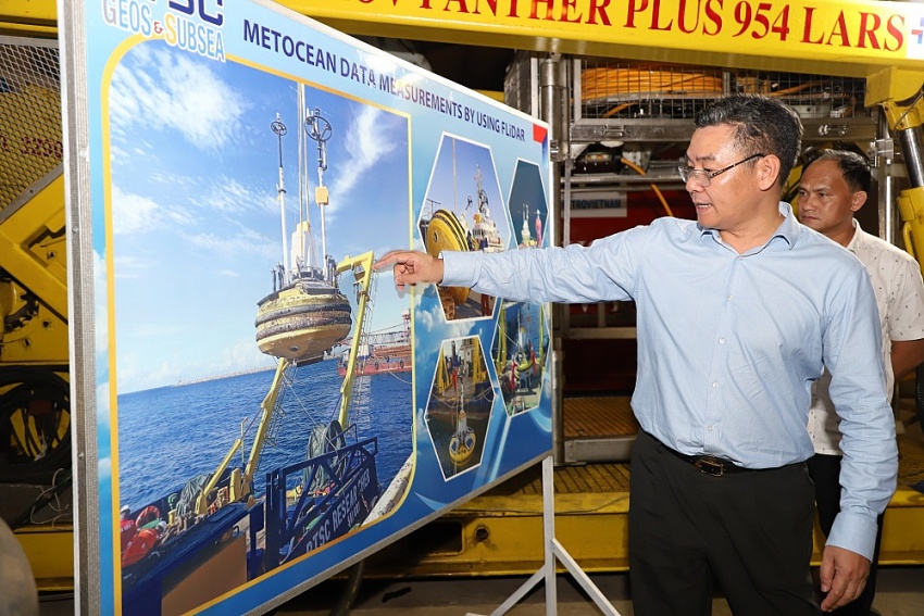 Ông Lê Mạnh Cường, Tổng Giám đốc PTSC giới thiệu với Chủ tịch UBND tỉnh Nguyễn Văn Thọ và đại diện các sở, ngành về tiến độ thực hiện các dự án điện gió ngoài khơi.