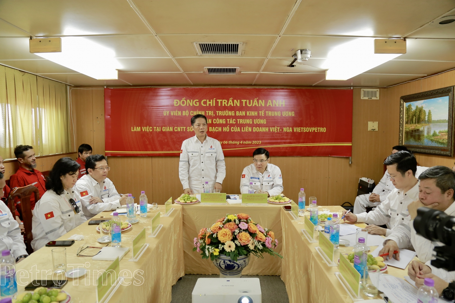 Sáng ngày 6/4/2023, đồng chí Trần Tuấn Anh - Ủy viên Bộ Chính trị, Trưởng Ban Kinh tế Trung ương và đoàn công tác đã có buổi làm việc với Tập đoàn Dầu khí Việt Nam (Petrovietnam) và Liên doanh Việt - Nga Vietsovpetro tại Giàn công nghệ trung tâm số 2, mỏ Bạch Hổ.