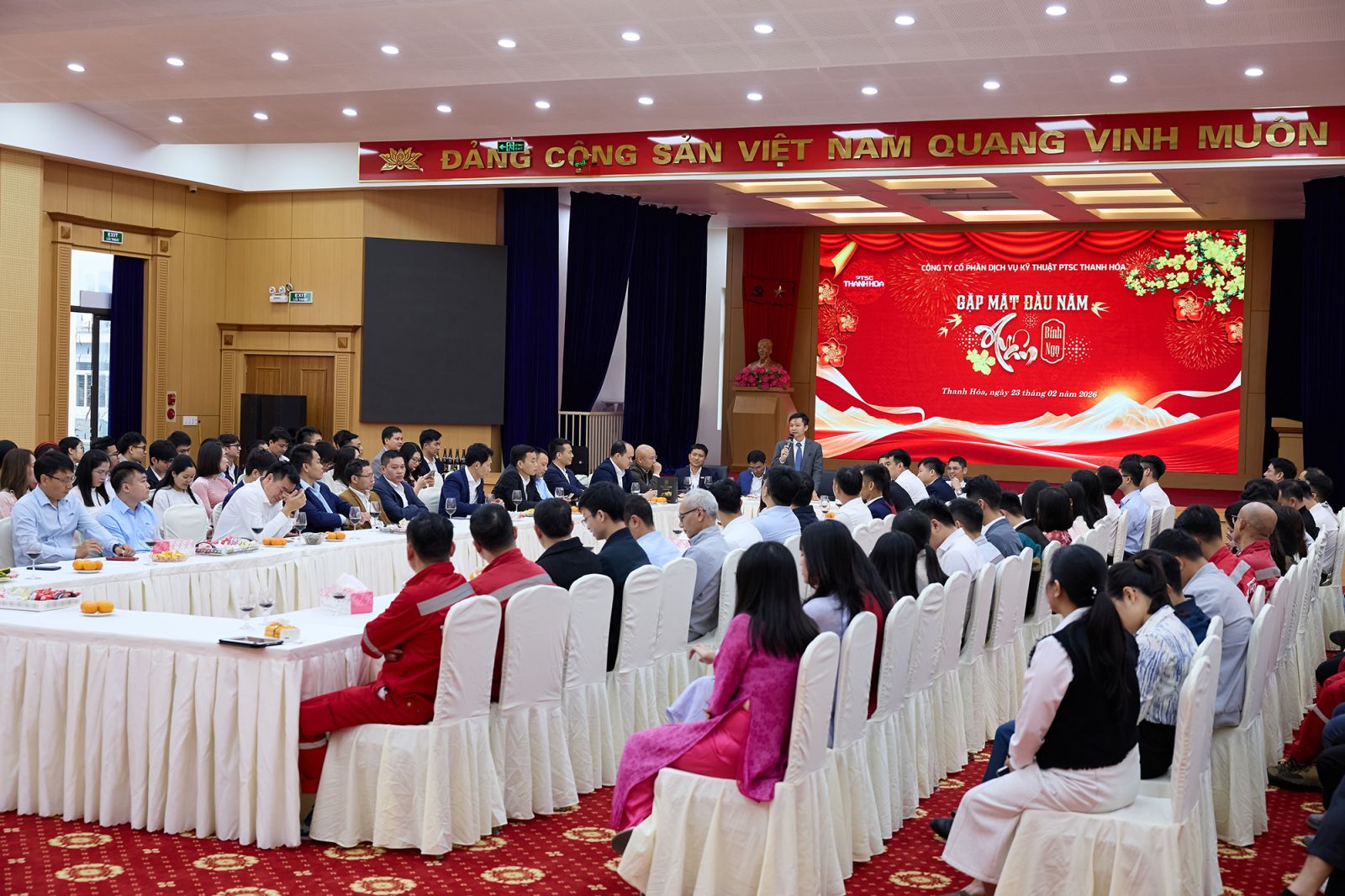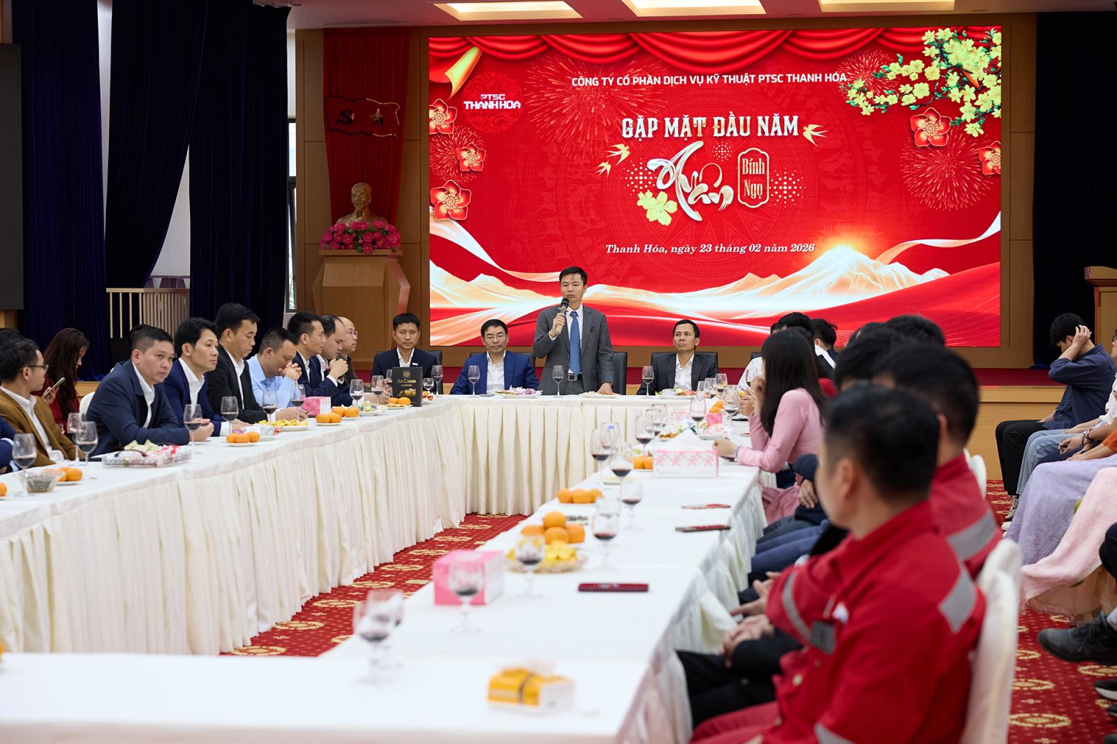 Sáng ngày 23/2 (tức Mùng 7 tháng Giêng Âm lịch), trong ngày làm việc đầu tiên của năm mới Bính Ngọ 2026, PTSC Thanh Hóa đã tổ chức chương trình gặp mặt đầu xuân trong không khí ấm áp, phấn khởi và tràn đầy năng lượng. Chương trình được tổ chức tại hai địa điểm: Văn phòng Trúc Lâm và Văn phòng Cảng, với sự tham gia của Ban Lãnh đạo cùng toàn thể Người lao động Công ty. Đây là hoạt động thường niên mang ý nghĩa khởi động tinh thần, tạo sự gắn kết và thống nhất quyết tâm ngay từ những ngày đầu năm mới.