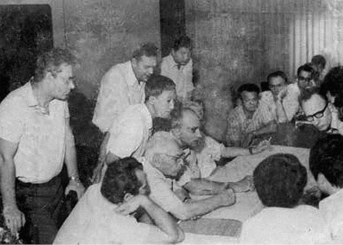 Nhóm chuyên gia Xô - Việt nghiên cứu các tài liệu về tiềm năng dầu khí của thềm lục địa miền Nam Việt Nam. Ngồi giữa là ông G. P. Ovanesov, bên phải là ông V. A. Yarmolyuk, sau lưng ông là ông Lê Văn Cự (năm 1979) Ảnh tư liệu của Phòng Truyền thống Petrovietnam.