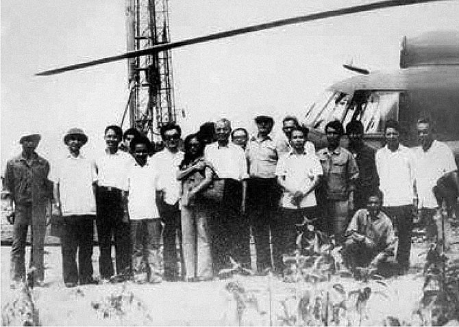 Tướng Đinh Đức Thiện (đứng giữa) và cố vấn về dầu khí G. A. Kostromin (đeo kính tối màu) cùng với các chuyên gia Việt Nam trong chuyến tham quan giếng dầu Cửu Long - 1 ở Đồng bằng sông Mê Kông Ảnh tư liệu của Phòng Truyền thống Petrovietnam.