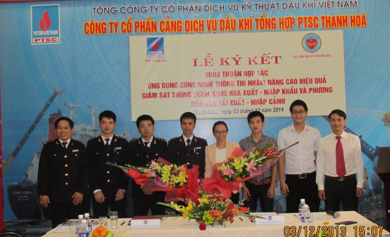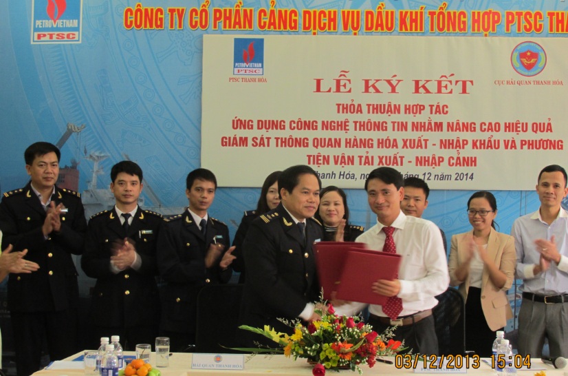 Phó cục trưởng Cục hải quan Thanh Hóa – ông Nguyễn Văn Huệ và Giám đốc công ty PTSC Thanh Hóa – ông Lê Văn Ngà ký thỏa thuận hợp tác