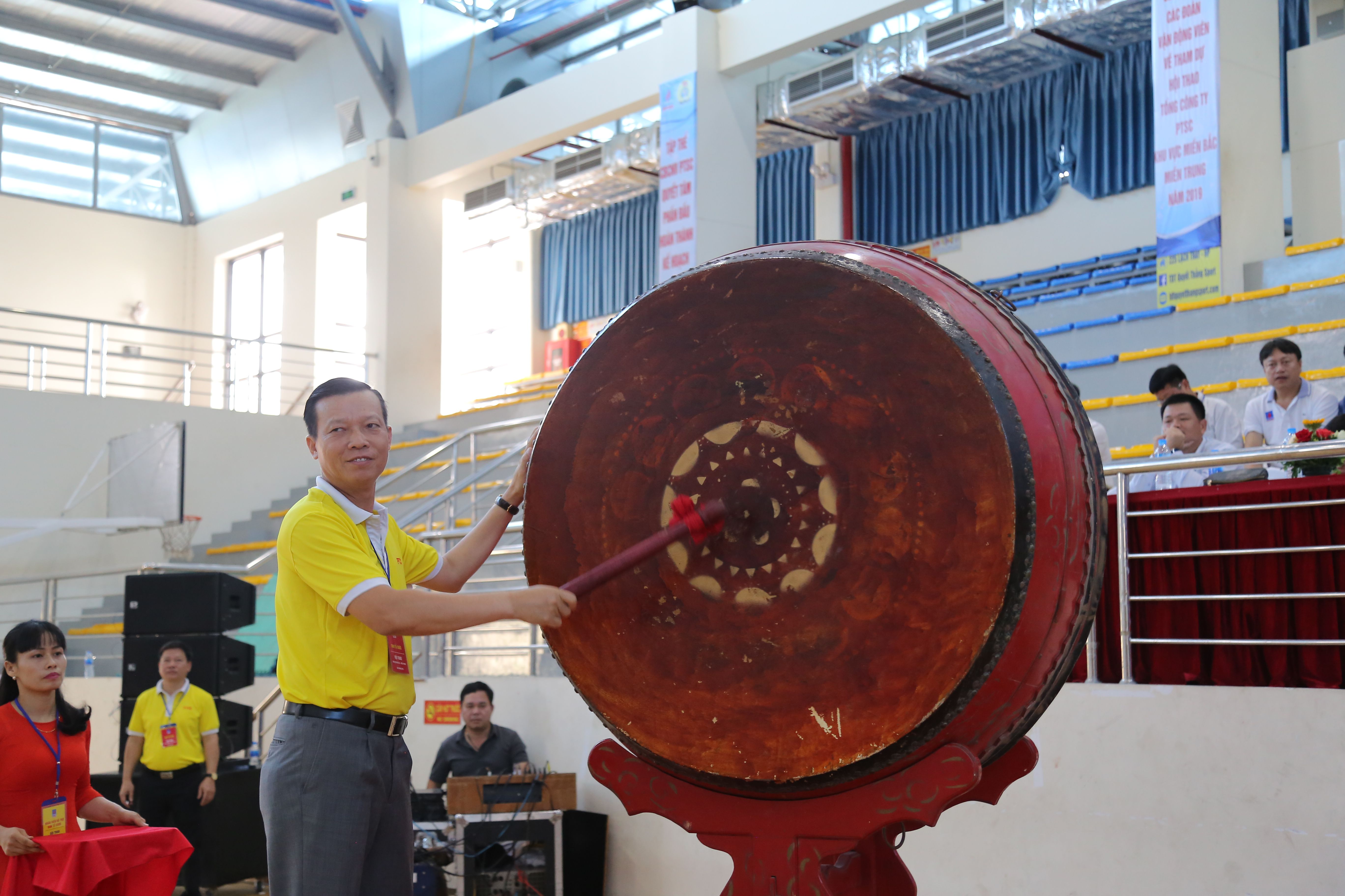 Chủ tịch Công đoàn Tổng công ty Nguyễn Trần Toàn đánh trống khai mạc Hội thao.