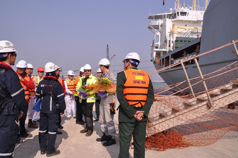 (Thuyền trưởng tàu M/V ANNE SOFIE nhận hoa chúc mừng từ lãnh đạo PTSC Thanh Hóa)