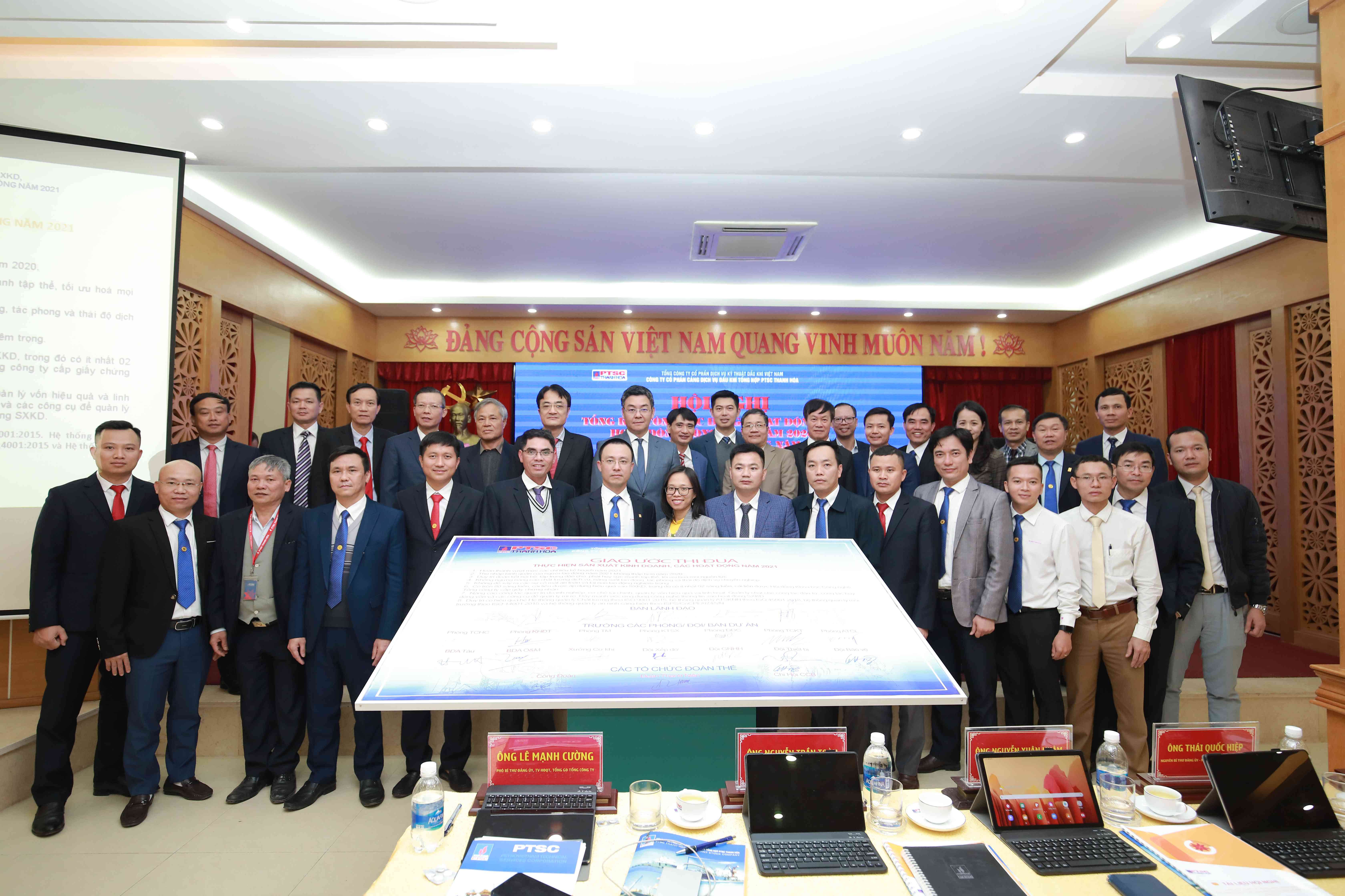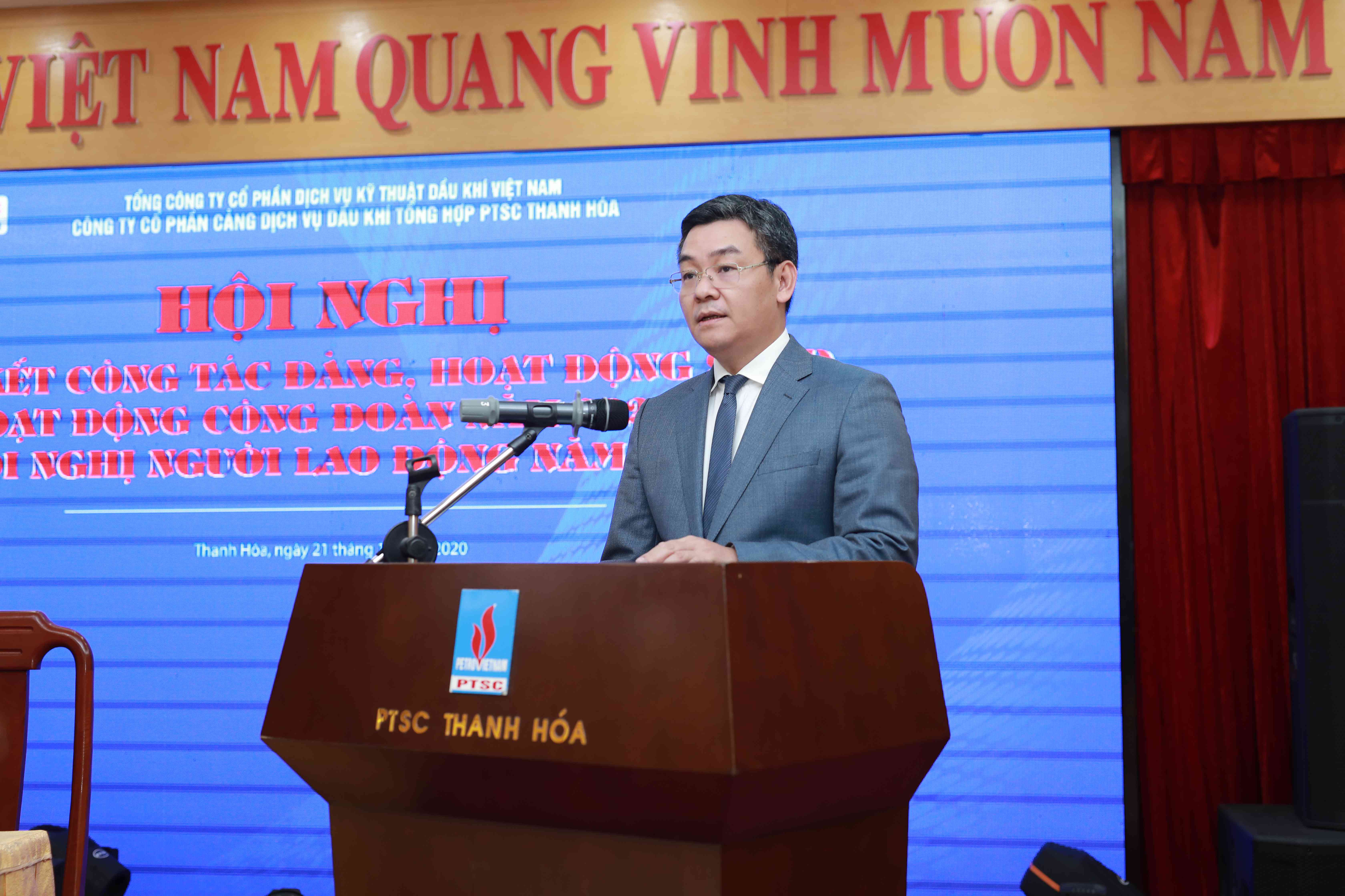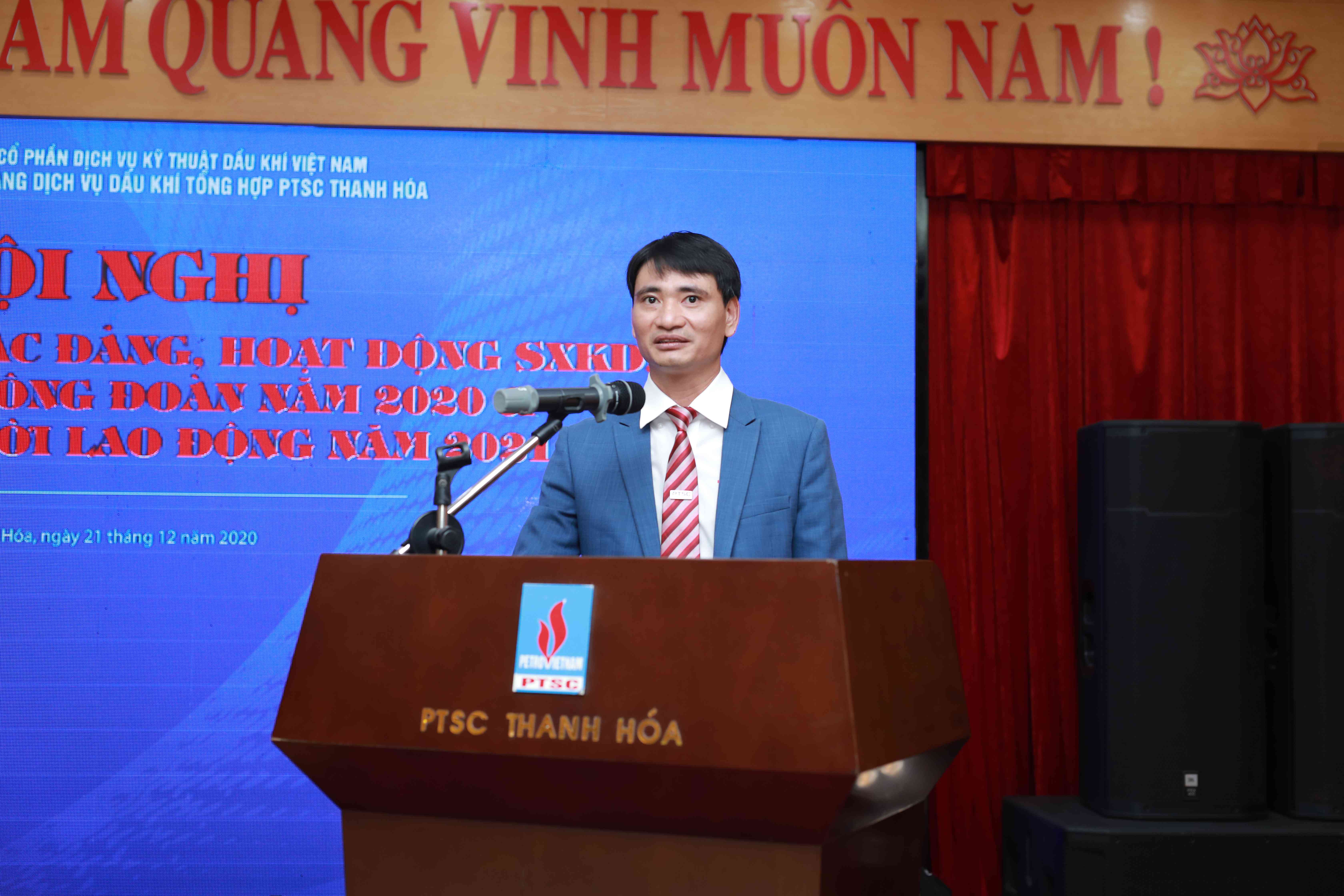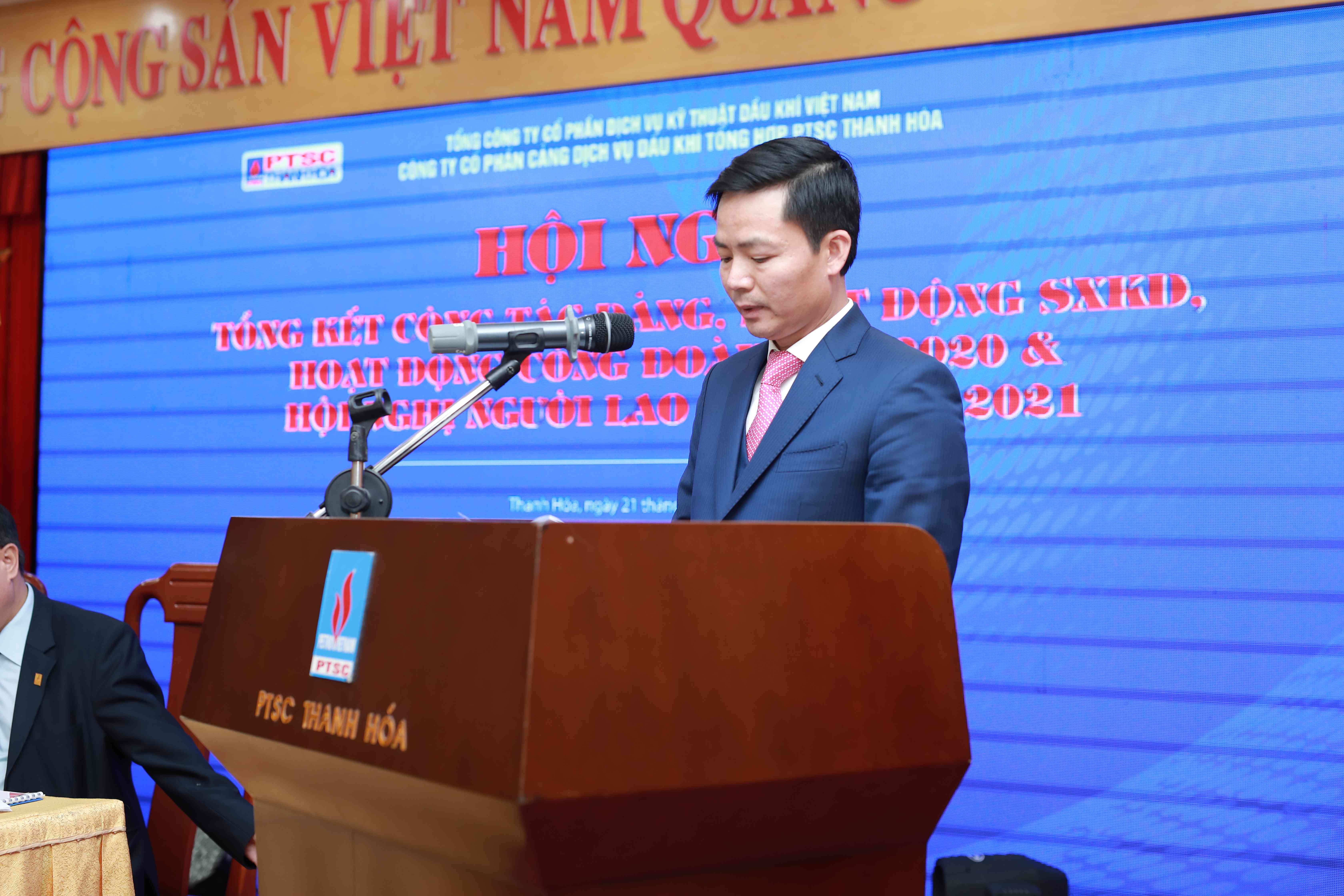 Chiều ngày 21/12/2020, Công ty Cổ phần Cảng Dịch vụ Dầu khí Tổng hợp PTSC Thanh Hóa (PTSC Thanh Hóa) đã tổ chức Hội nghị tổng kết công tác Đảng, hoạt động Công đoàn năm 2020, Hội nghị Người lao động năm 2021. Hội nghị vinh dự được đón tiếp đồng chí Phan Thanh Tùng - Bí thư Đảng ủy, Chủ tịch HĐQT Tổng Công ty; đồng chí Lê Mạnh Cường - Phó Bí thư Đảng ủy, Tổng Giám đốc Tổng công ty; đồng chí Nguyễn Xuân Nhậm - Nguyên Tổng giám đốc Tập đoàn, nguyên TGĐ Tổng công ty; đồng chí Thái Quốc Hiệp - Nguyên Bí thư Đảng ủy, nguyên Chủ tịch HĐQT Tổng công ty; đồng chí Nguyễn Trần Toàn - Uỷ viên BTV Đảng ủy, Phó Tổng Giám đốc, Chủ tịch Công đoàn Tổng công ty; đồng chí Tạ Đức Tiến - Phó Tổng giám đốc Tổng công ty cùng các đồng chí trong HĐQT, BKS, lãnh đạo các Ban/Văn phòng Tổng công ty, lãnh đạo và Chủ tịch công đoàn các đơn vị thành viên tham dự. Về phía PTSC Thanh Hóa có sự tham gia đầy đủ các đồng chí trong Đảng ủy, HĐQT, BGĐ, BKS cùng 124 đại biểu đại diện cho 446 cán bộ, đảng viên, Người lao động Công ty PTSC Thanh Hóa.