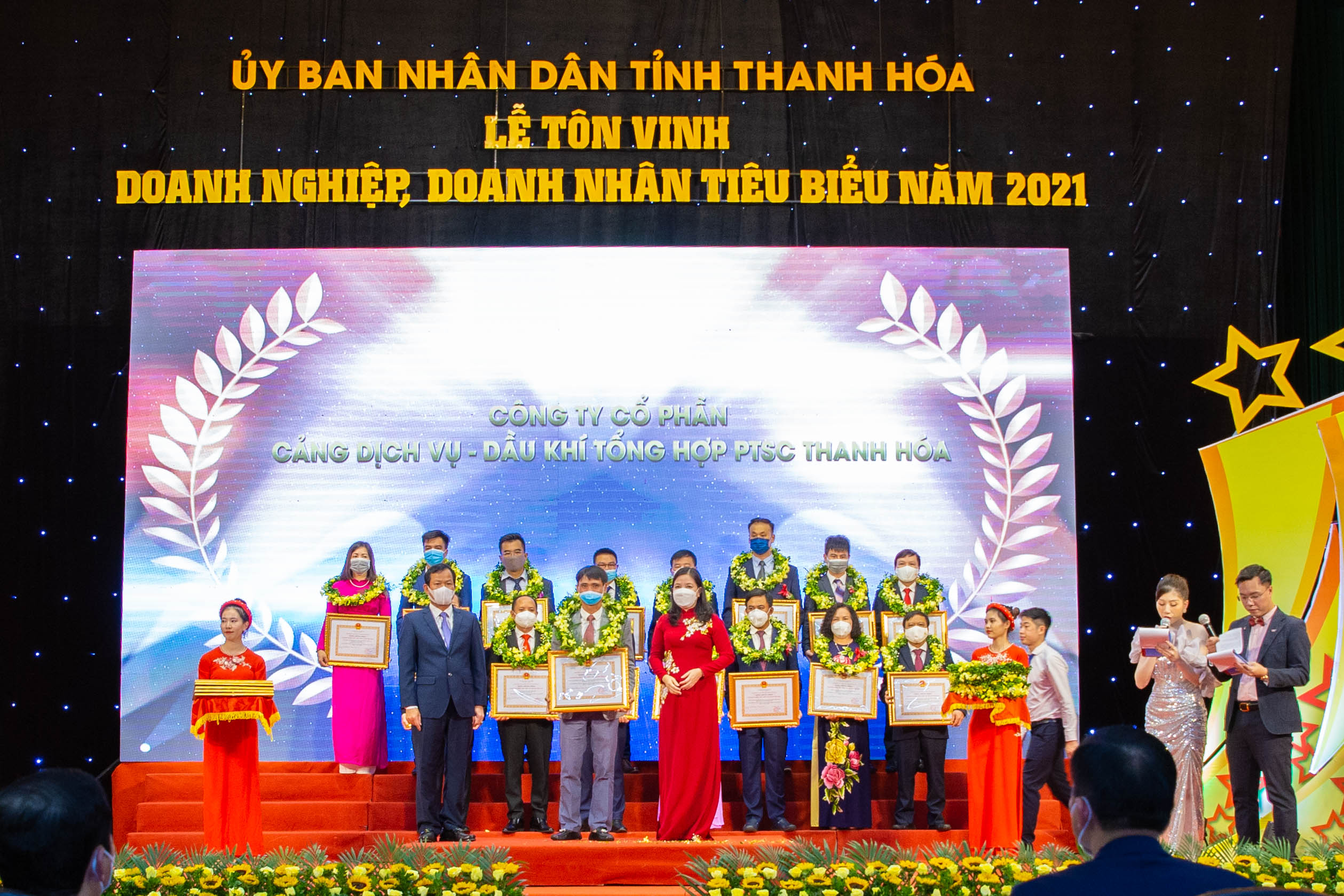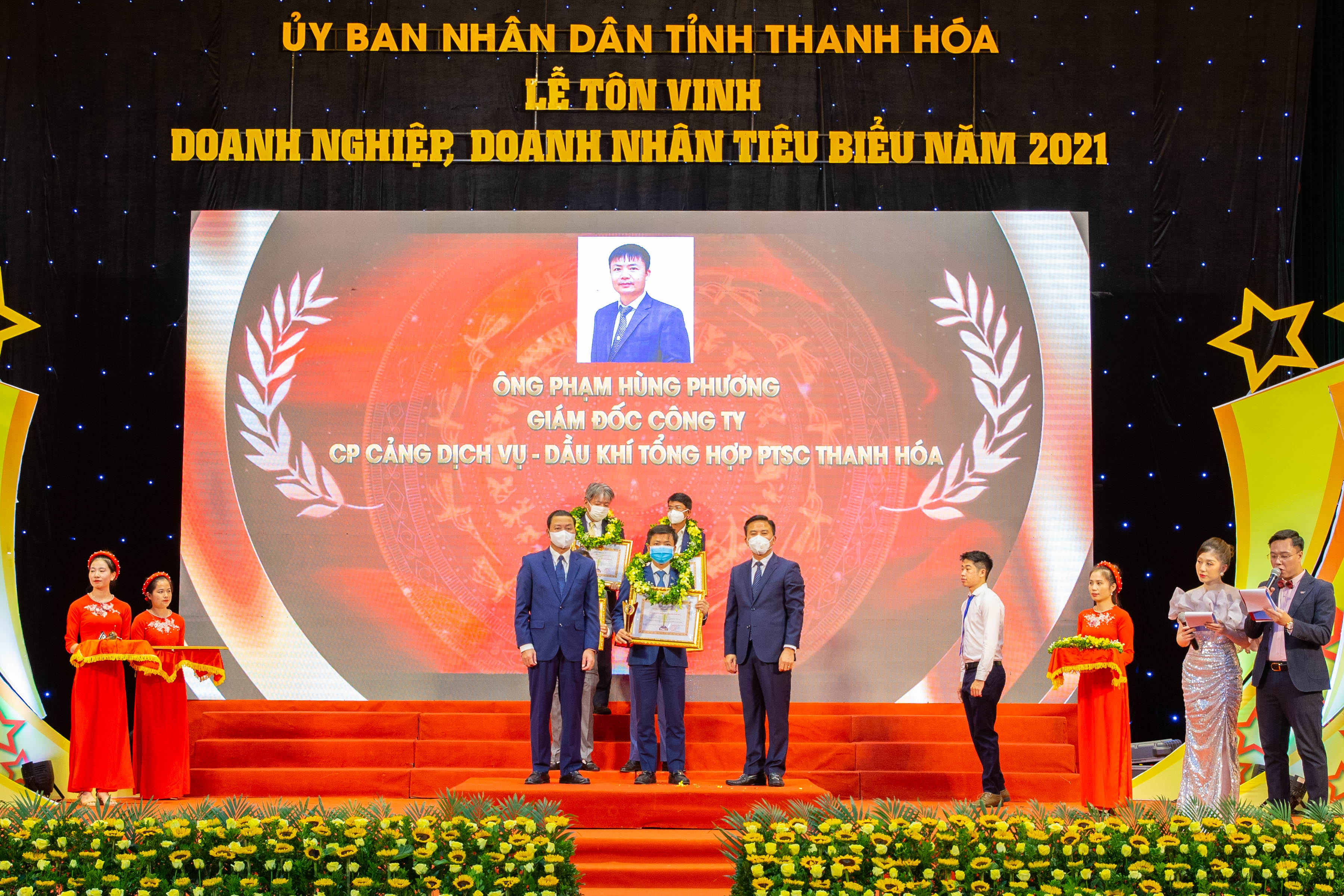 Tại lễ tôn vinh, các đồng chí lãnh đạo tỉnh đã trao tặng cup “Doanh nhân xứ Thanh” cho 39 doanh nhân, chứng nhận “Doanh nghiệp tiêu biểu xứ Thanh” cho 41 doanh nghiệp và Bằng khen của Chủ tịch UBND tỉnh cho 33 doanh nghiệp có thành tích xuất sắc trong sản xuất, kinh doanh. Ông Phạm Hùng Phương - Giám đốc Công ty PTSC Thanh Hóa vinh dự là 1 trong 39 doanh nhân tiêu biểu của tỉnh Thanh Hóa được Chủ tịch tỉnh trao tặng bằng khen vì đã có thành tích xuất sắc, nhiều đóng góp trong hoạt động sản xuất, kinh doanh năm 2021. Công ty Cổ phần Cảng Dịch vụ Dầu khí Tổng hợp PTSC Thanh Hóa vinh dự là doanh nghiệp tiêu biểu năm 2021 của tỉnh được vinh danh tại Lễ tôn vinh.