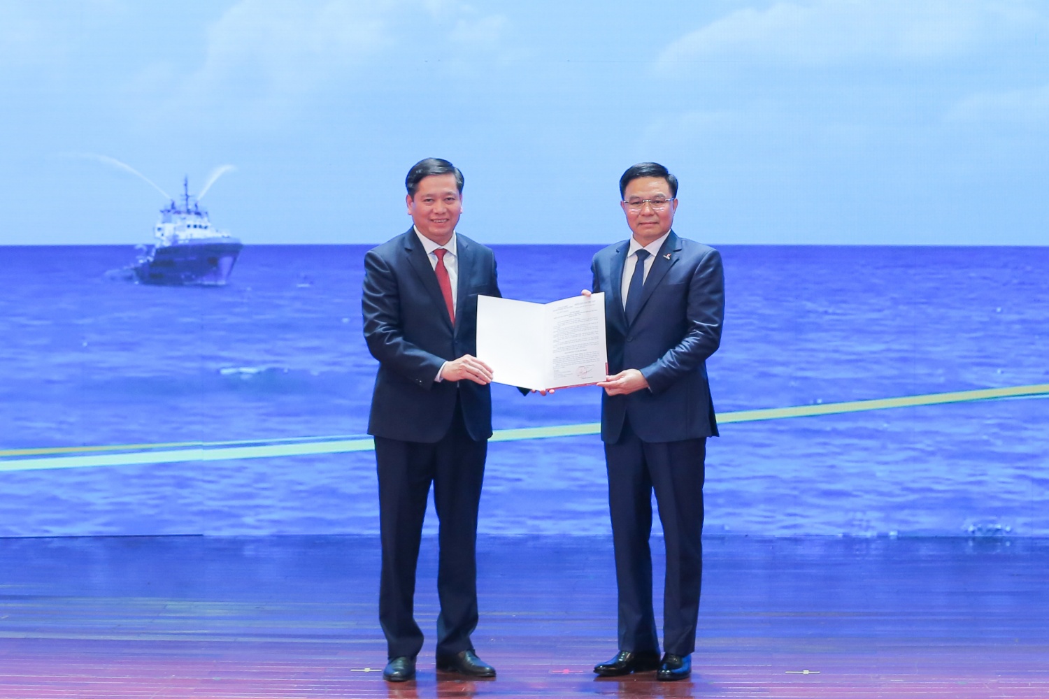 Đồng chí Nguyễn Long Hải, Ủy viên dự khuyết Trung ương Đảng, Bí thư Đảng ủy Khối Doanh nghiệp Trung ương trao quyết định chuẩn y chức danh Bí thư Đảng ủy Tập đoàn Dầu khí Quốc gia Việt Nam đối với đồng chí Lê Mạnh Hùng.