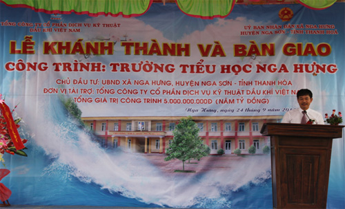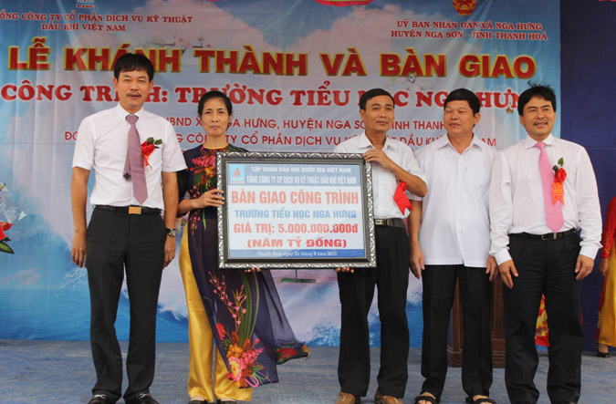 Trường Tiểu học Nga Hưng là công trình nhà lớp học 2 tầng, 10 phòng học theo tiêu chuẩn Quốc gia về trường tiểu học, có tổng diện tích là: 755 m2 trong đó diện tích sử dụng là 695 m2, mỗi phòng học có diện tích 48m2 với đầy đủ các công trình phụ trợ như cổng, tường rào, nhà vệ sinh, bể nước, nhà xe, phòng trực, sân trường cũng đã được xây dựng và hoàn thiện. Tổng kinh phí đầu tư cho công trình Trường tiểu học xã Nga Hưng là: 5.000.000.000 đồng (5 tỷ đồng), được tài trợ 100% vốn từ nguồn quỹ An sinh xã hội năm 2012 của Tổng Công ty PTSC. Việc bàn giao và đưa vào sử dụng Trường Tiểu học Nga bổ sung thêm cơ sở hạ tầng phục vụ công tác nuôi dạy học được tốt hơn trên mảnh đất Nga Hưng Anh Hùng, đồng thời cũng thể hiện nét đẹp truyền thống văn hóa tốt đẹp của PTSC góp sức cùng cộng đồng trong công cuộc xã hội hóa giáo dục.