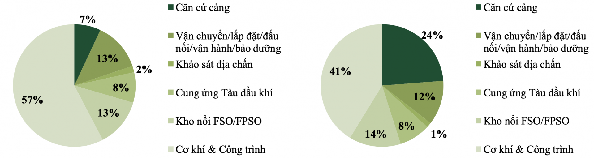 Tỷ trọng doanh thu (Biểu đồ bên trái) và tỷ trọng lợi nhuận gộp (Biểu đồ bên phải) các mảng kinh doanh của Dịch vụ Kỹ thuật Dầu khí (Nguồn: VCBS)