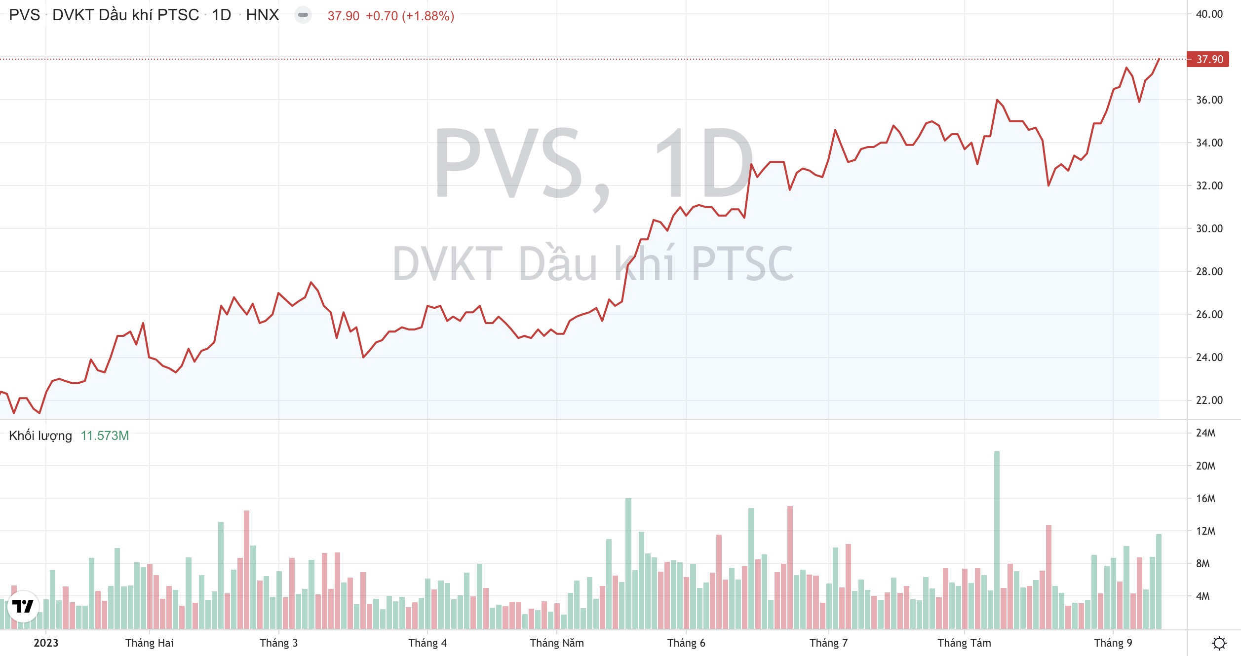 Khối lượng giao dịch và xu hướng giá cổ phiếu PVS của Dịch vụ Kỹ thuật Dầu khí từ đầu năm 2023 đến nay. (Nguồn: TradingView)