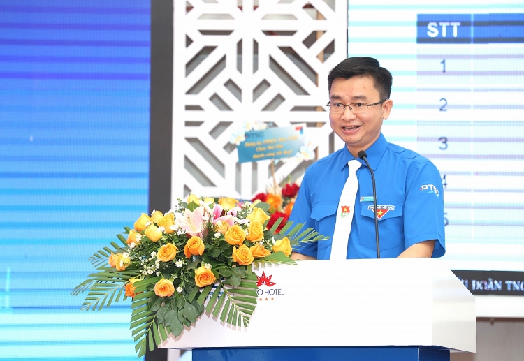 Đồng chí Trần Hải Phương - Bí thư Đoàn Tổng công ty PTSC khóa mới báo cáo định hướng, nhiệm vụ nhiệm kỳ 2022-2027.
