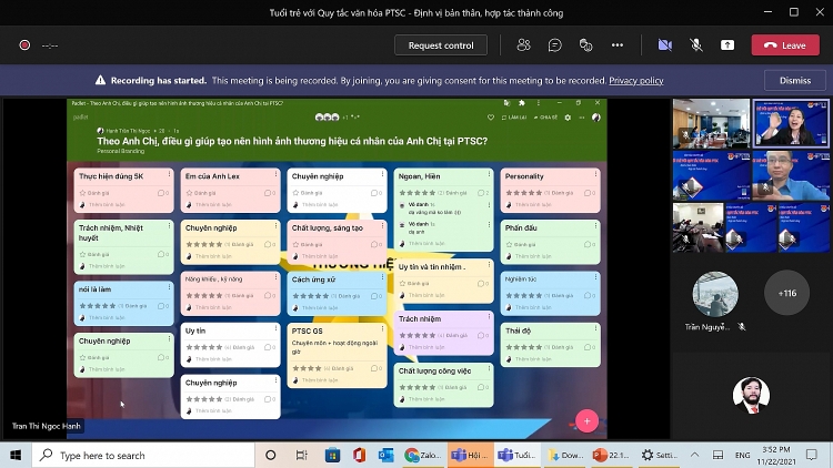 Hướng đến chào mừng kỷ niệm 60 năm Ngày Truyền thống ngành Dầu khí Việt Nam (27/11/1961 - 27/11/2021) và triển khai tuyên truyền Quy tắc văn hóa PTSC, ngày 22/11/2021, Đoàn Thanh niên phối hợp với Ban Tổ chức Nhân sự Tổng công ty PTSC và Trung tâm Bồi dưỡng nâng cao (ATC) - Trường Đại học Dầu khí Việt Nam (PVU) tổ chức Hội thảo chuyên đề “Tuổi trẻ với Quy tắc văn hóa PTSC - Định vị bản thân, hợp tác thành công” trực tuyến qua MS Teams.